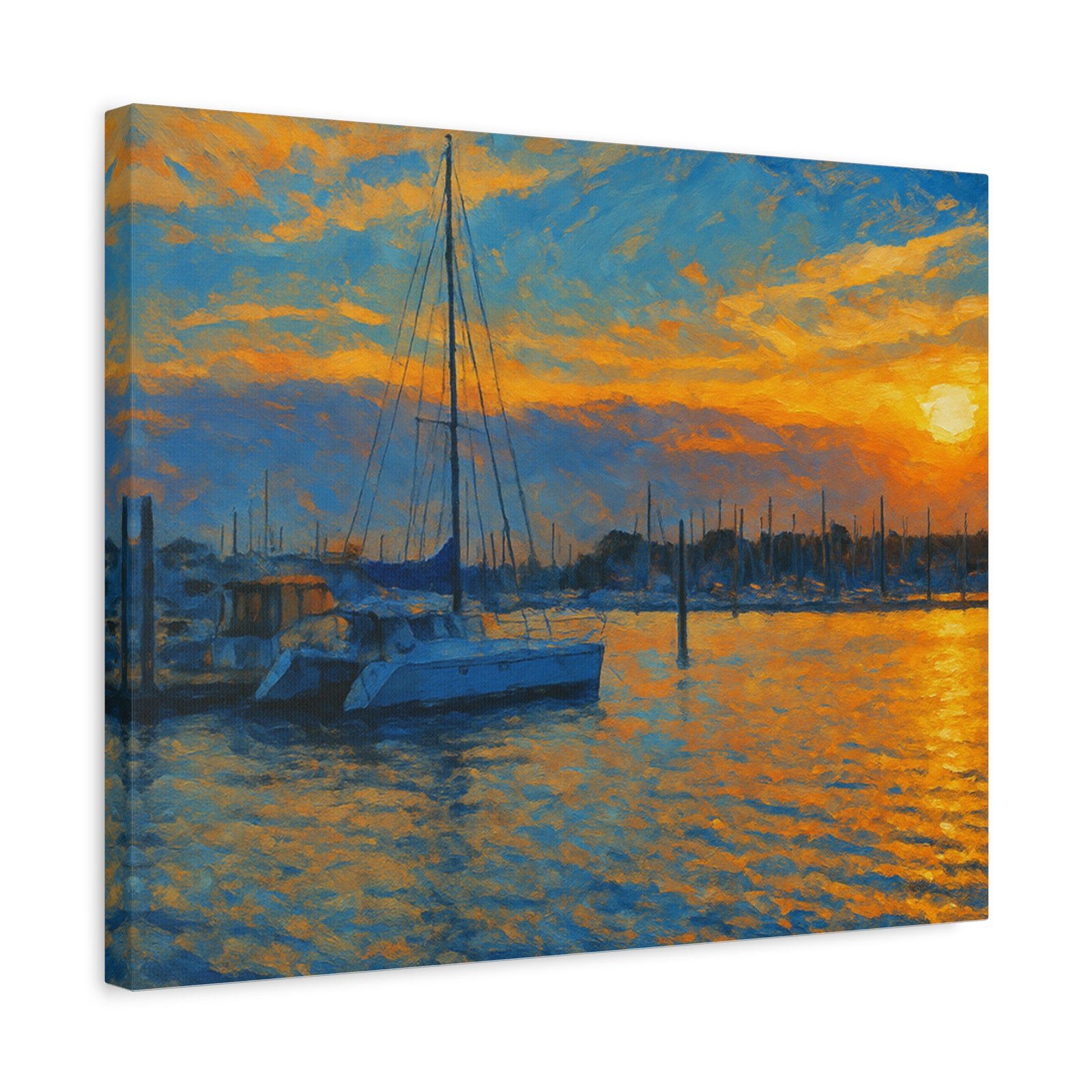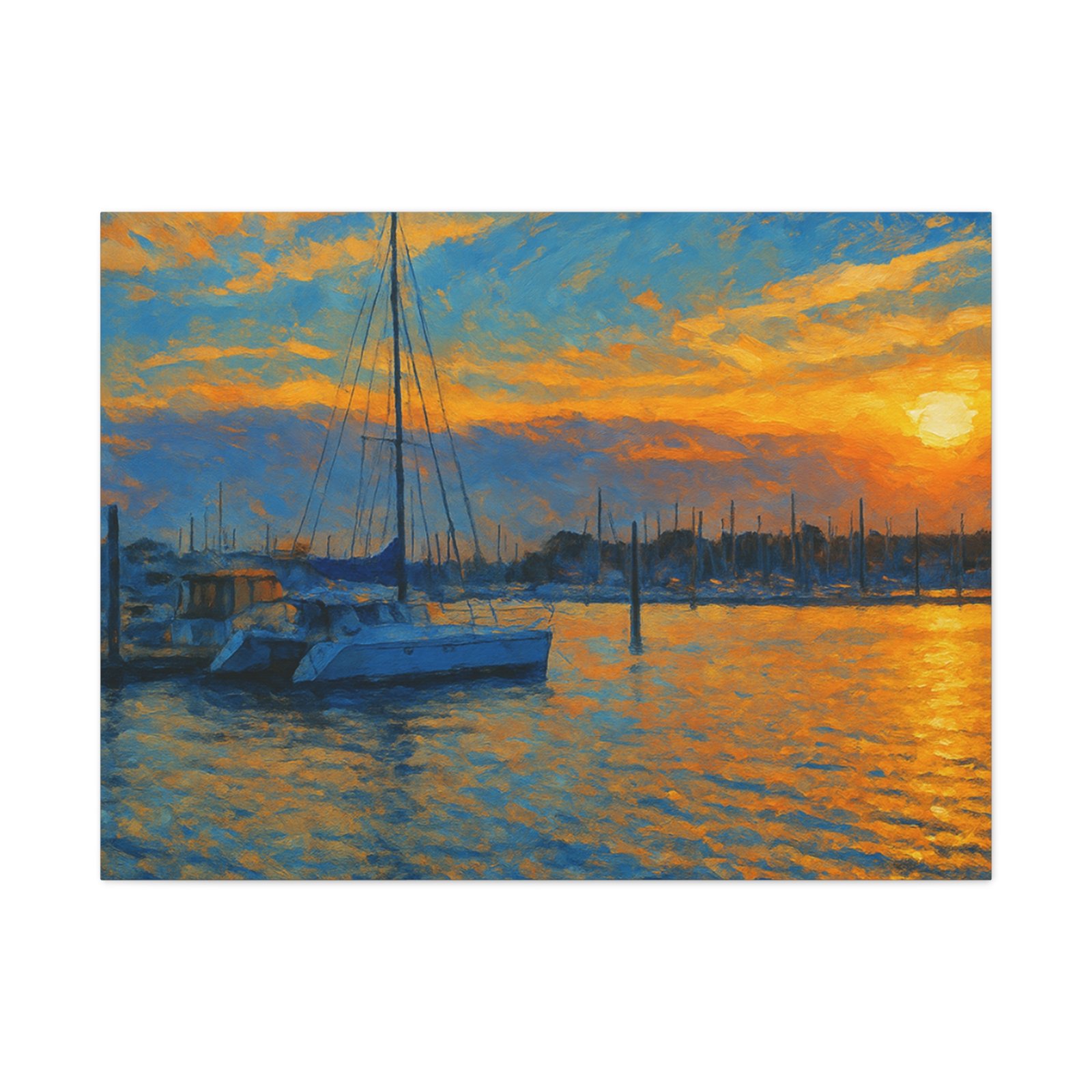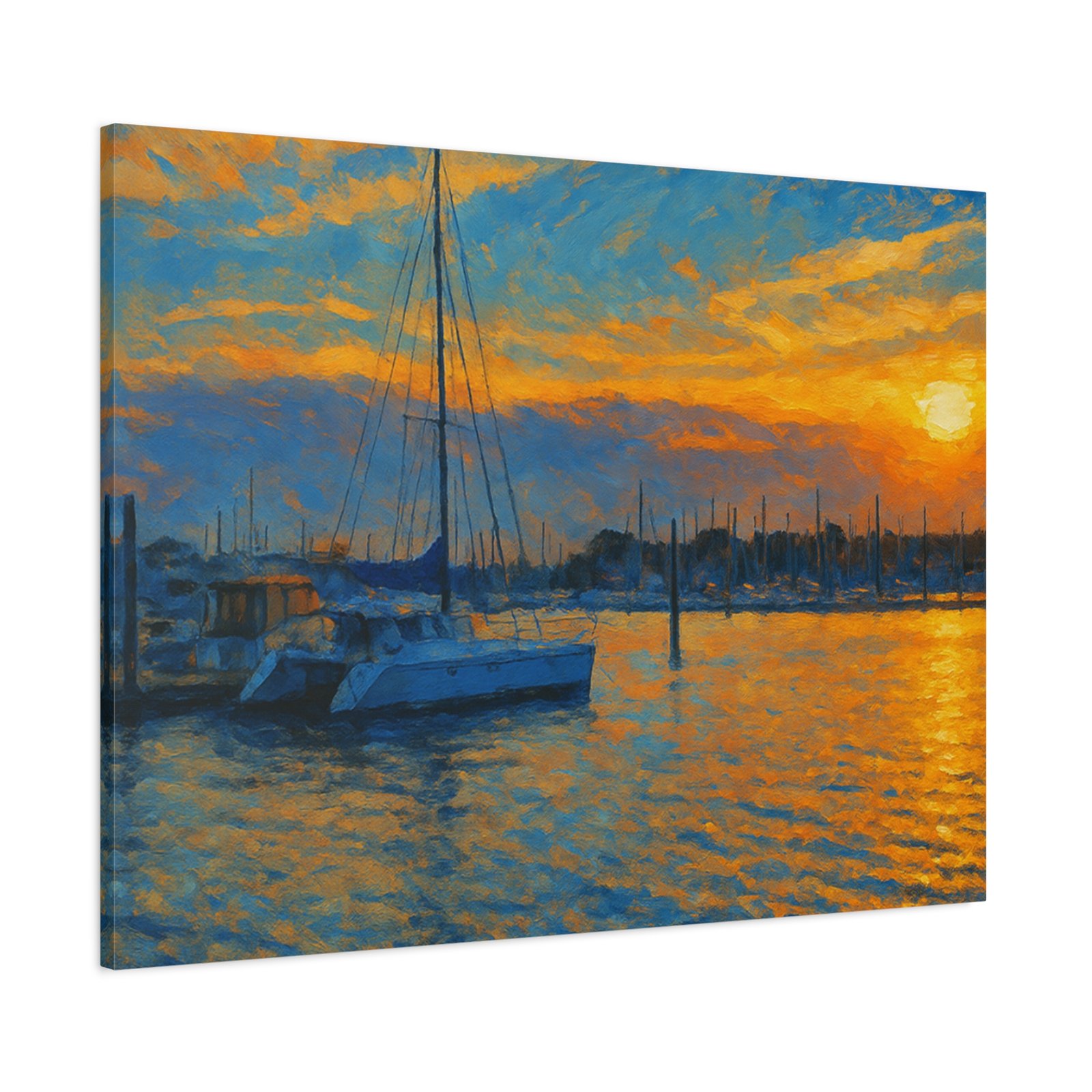 The scene highlights a marina bathed in glowing orange and gold, with sailboats resting peacefully against calm waters. Printed on high-quality matte canvas, this piece delivers rich tones and a serene atmosphere that instantly warms any space — from living rooms and bedrooms to office walls.