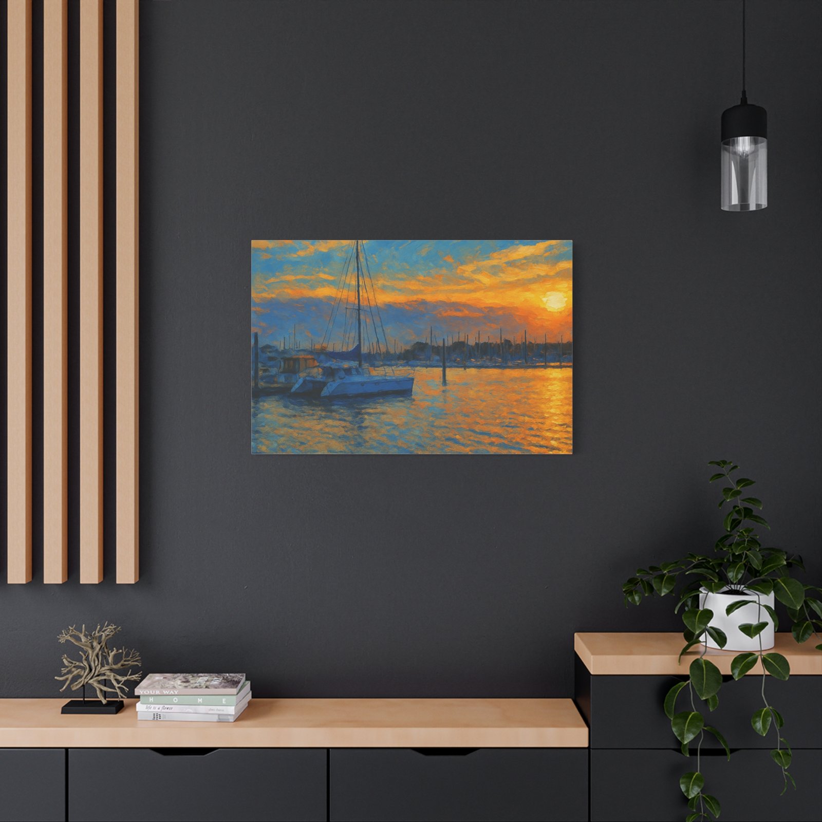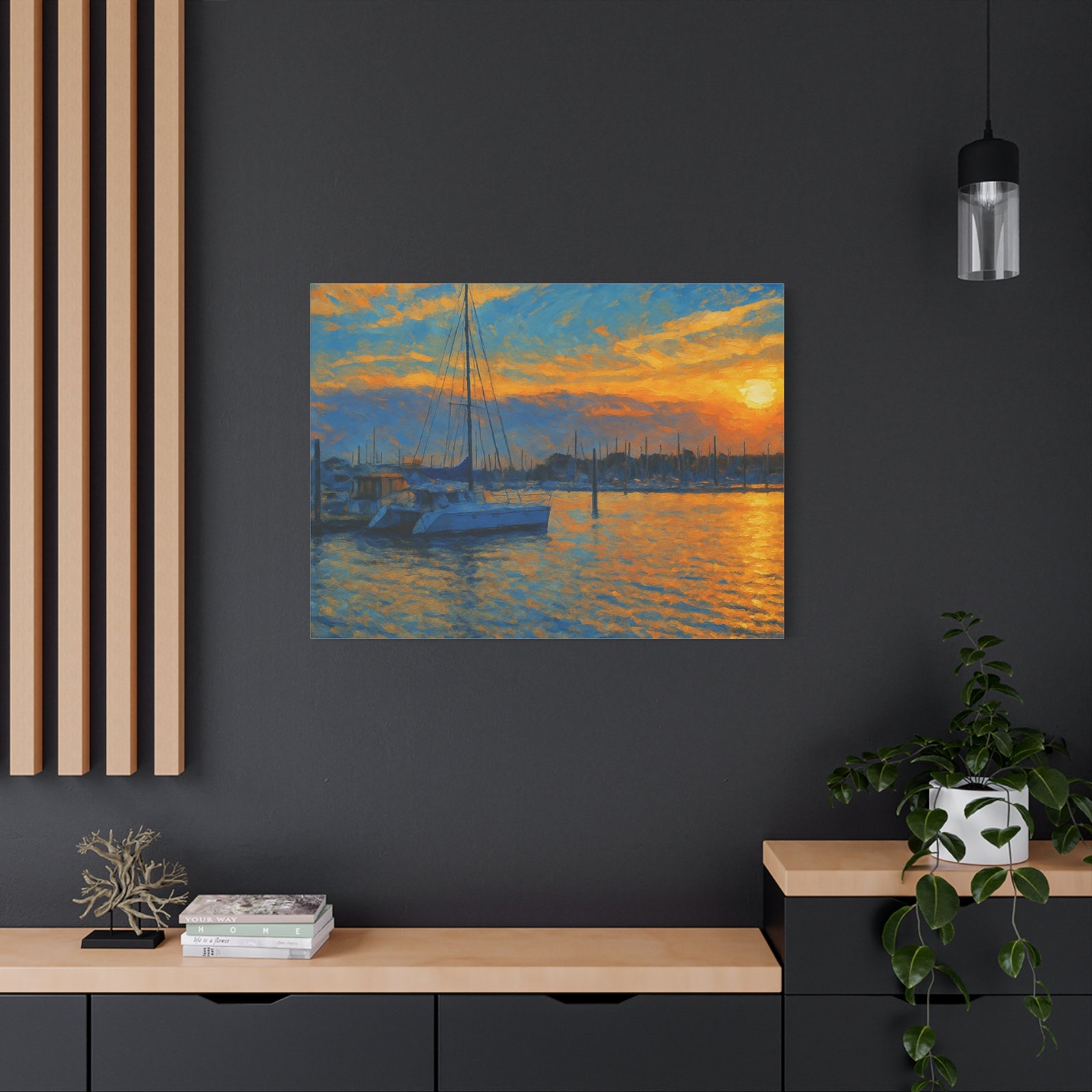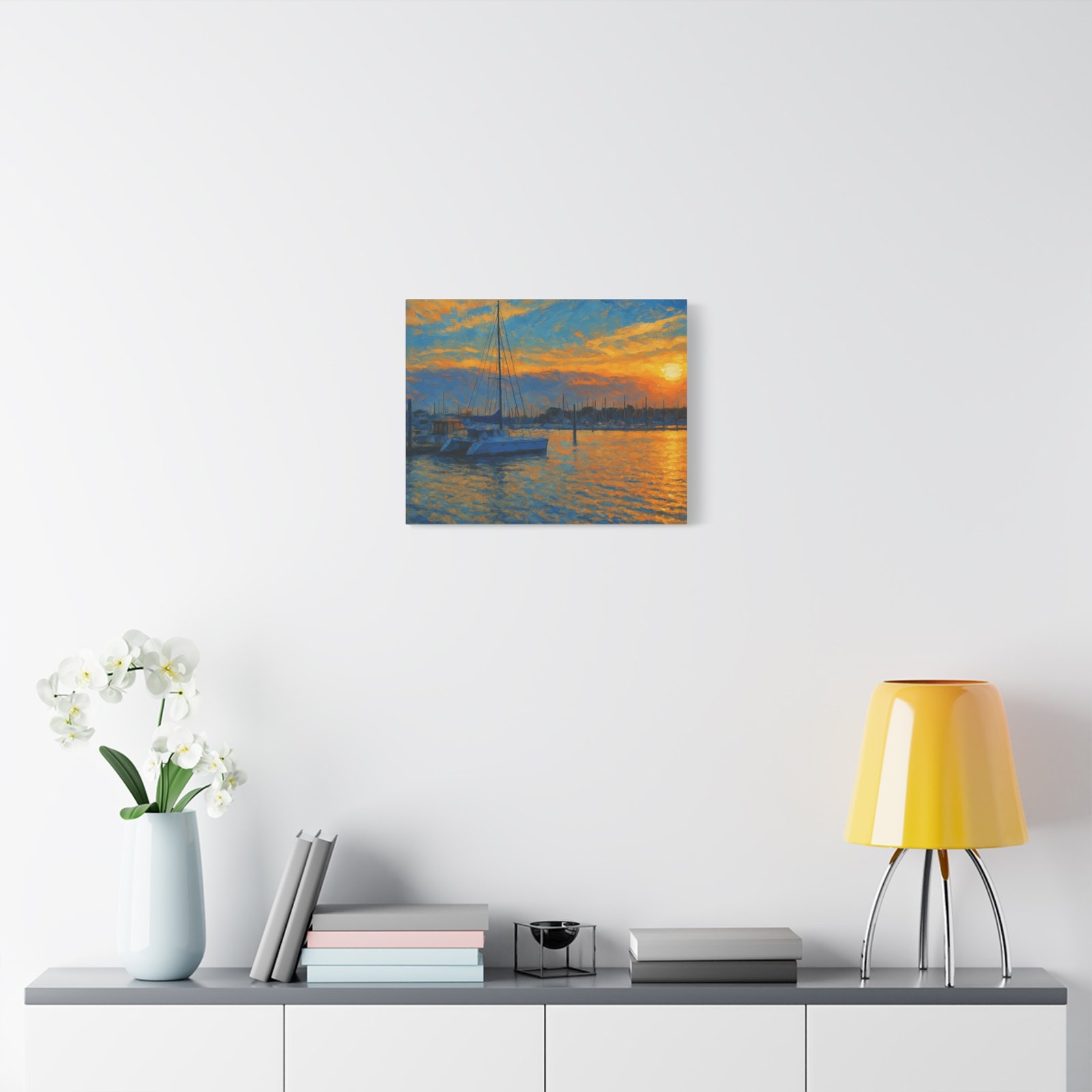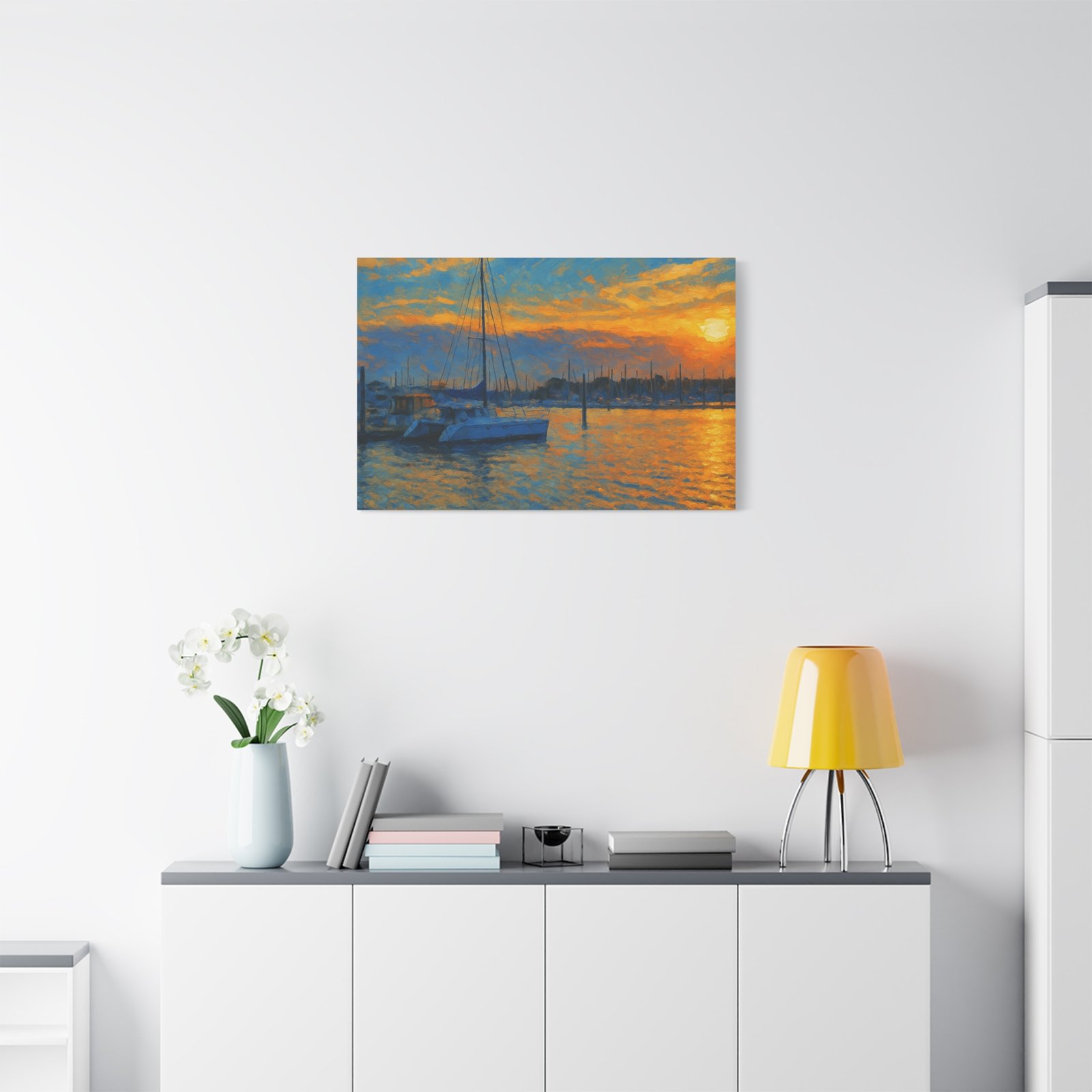 The scene highlights a marina bathed in glowing orange and gold, with sailboats resting peacefully against calm waters. Printed on high-quality matte canvas, this piece delivers rich tones and a serene atmosphere that instantly warms any space — from living rooms and bedrooms to office walls.